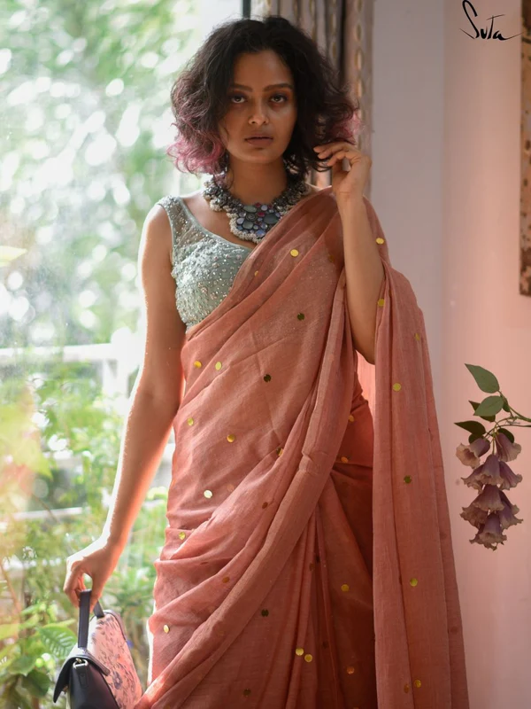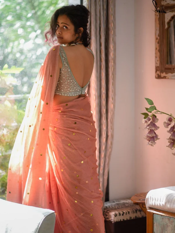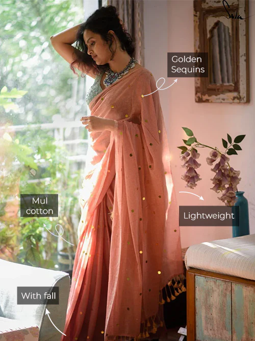 Sunset Star -Orange Peach Mulmul Cotton Sequins Saree with Tassels