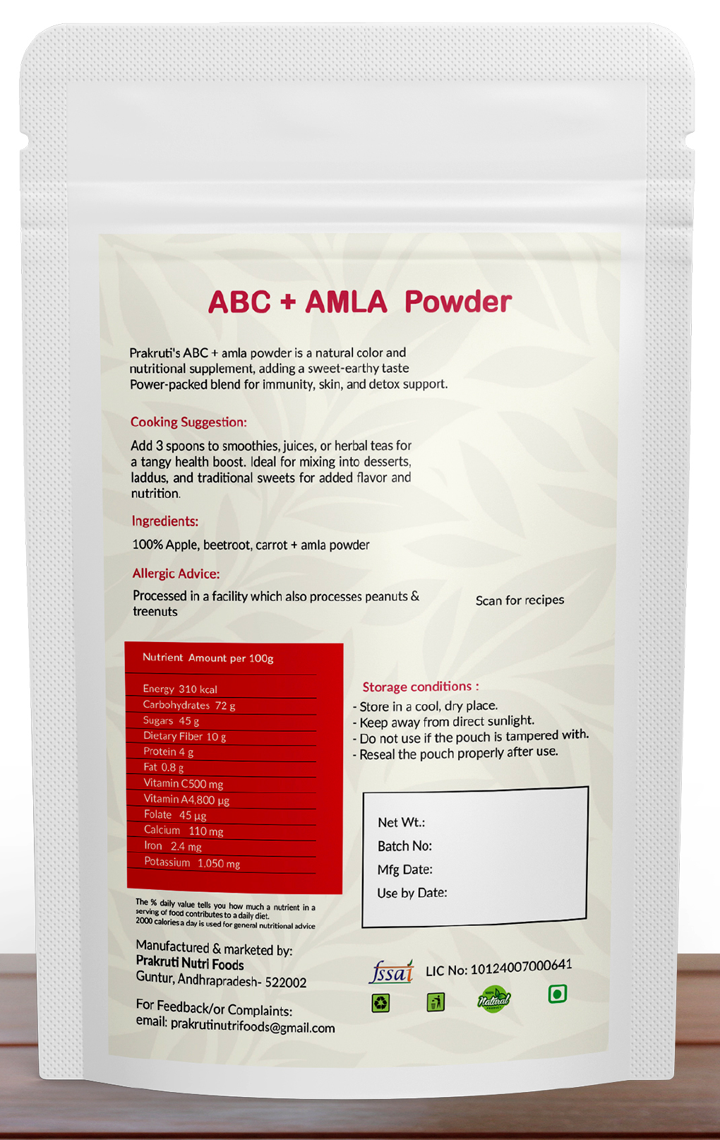 Our premium Apple Beetroot Carrot Amla Powder is a natural superfood blend crafted to boost your daily nutrition and vitality. This carefully formulated mix combines the sweetness of apples, the earthy richness of beetroot, the natural beta-carotene of carrots, and the vitamin C powerhouse of amla (Indian gooseberry). Perfect for health-conscious individuals, this powder dissolves easily in water, milk, or smoothies, making it a convenient addition to your wellness routine.