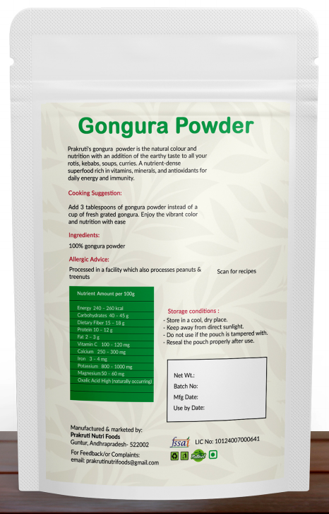 Our Gongura Powder is carefully processed and packaged to retain maximum flavor and nutritional value. It contains no artificial additives, preservatives, or fillers, making it a pure and wholesome addition to your spice collection. Whether you're a professional chef or a home cook looking to explore traditional flavors, this powder offers convenience without compromising on authenticity or taste.