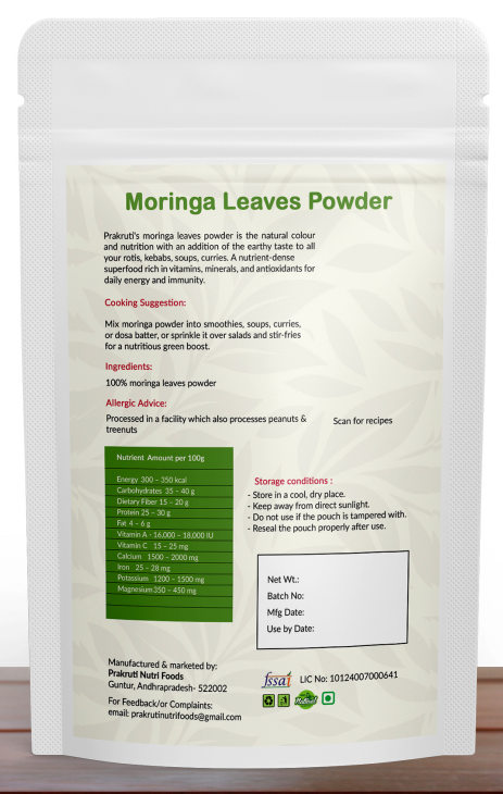 Our finely ground Moringa powder is 100% pure, with no additives or fillers, making it an ideal addition to smoothies, teas, soups, and various recipes. Simply mix a teaspoon into your favorite beverages or meals to unlock the powerful health benefits of this ancient superfood. Whether you're looking to enhance your immune system, improve digestion, or increase your energy naturally, Moringa Leafs Powder is the perfect choice for health-conscious individuals.